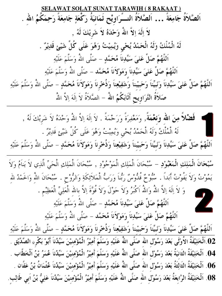 Bacaan sebelum memulakan solat sunat tarawih : Ini bukanlah satu masalah kerana pada zaman rasulullah saw sembahyang tarawih biasanya dikerjakan sebanyak 8 rakaat sahaja supaya tidak . Apabila selesai mendirikan 8 raka'at solat tarawih, membaca doa berikut;. Bacaan selawat solat tarawih 8 rakaat muka belakang (brochure). Bacaan selawat solat tarawih 8 rakaat muka hadapan (brochure).
